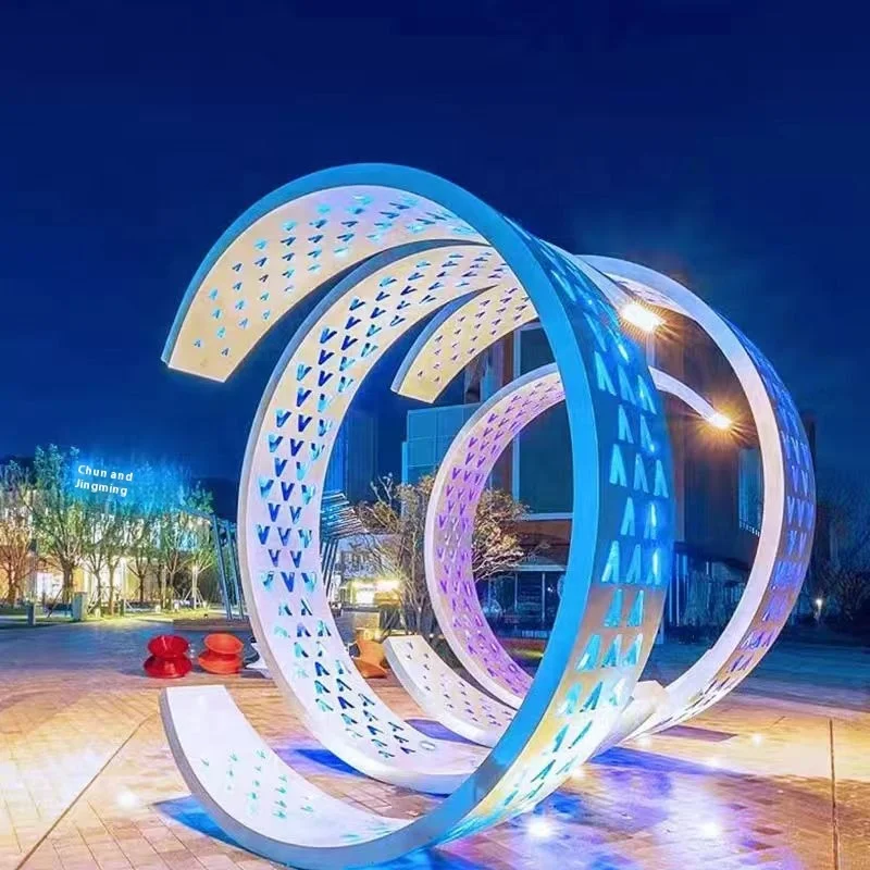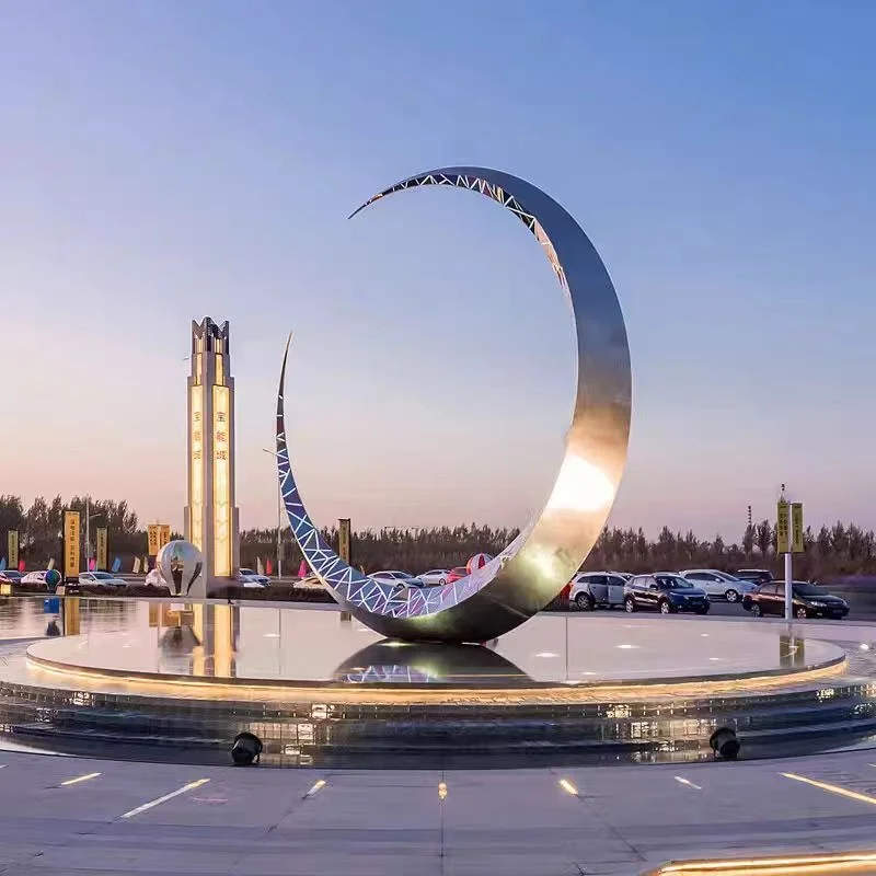 This imposing outdoor stainless steel sculpture takes the shape of a singular hollowed-out glowing moon ring that serves as a powerful centerpiece of park landscaping. Deep carving design, exquisite craftsmanship and artistic beauty perfect combination. Astounding light and shadow show artistic tension during daytime; and soft luminous effect creates romantic atmosphere and gives the park a dreamy color during nighttime, making visitors feel like they are in a magical moonlight world.